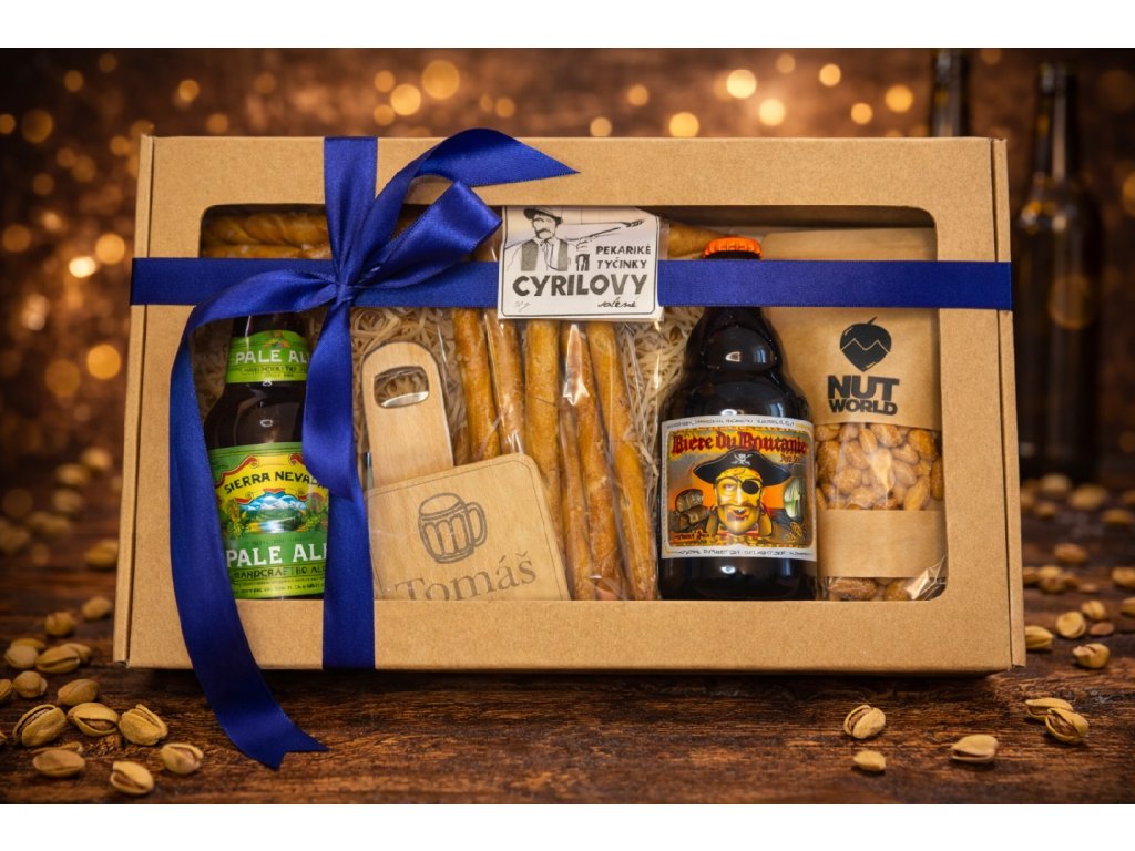 Dvě pečlivě vybraná craftová piva doplňuje praktický pivní otvírák, stylový podtácek a osvědčené pivní pochutiny. Kešu oříšky a hospodské tyčinky vytvářejí ideální kombinaci k posezení s přáteli nebo pohodovému večeru doma.