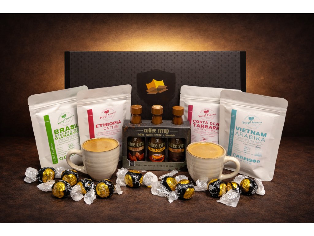 Uvnitř této kávové dárkové krabice najdete čtyři druhy výběrové kávy, dva stylové šálky na kávu, sirupy do kávy, které dodají nápojům jedinečnou chuť, a také čokoládové Lindt pralinky jako sladkou tečku ke každému šálku.